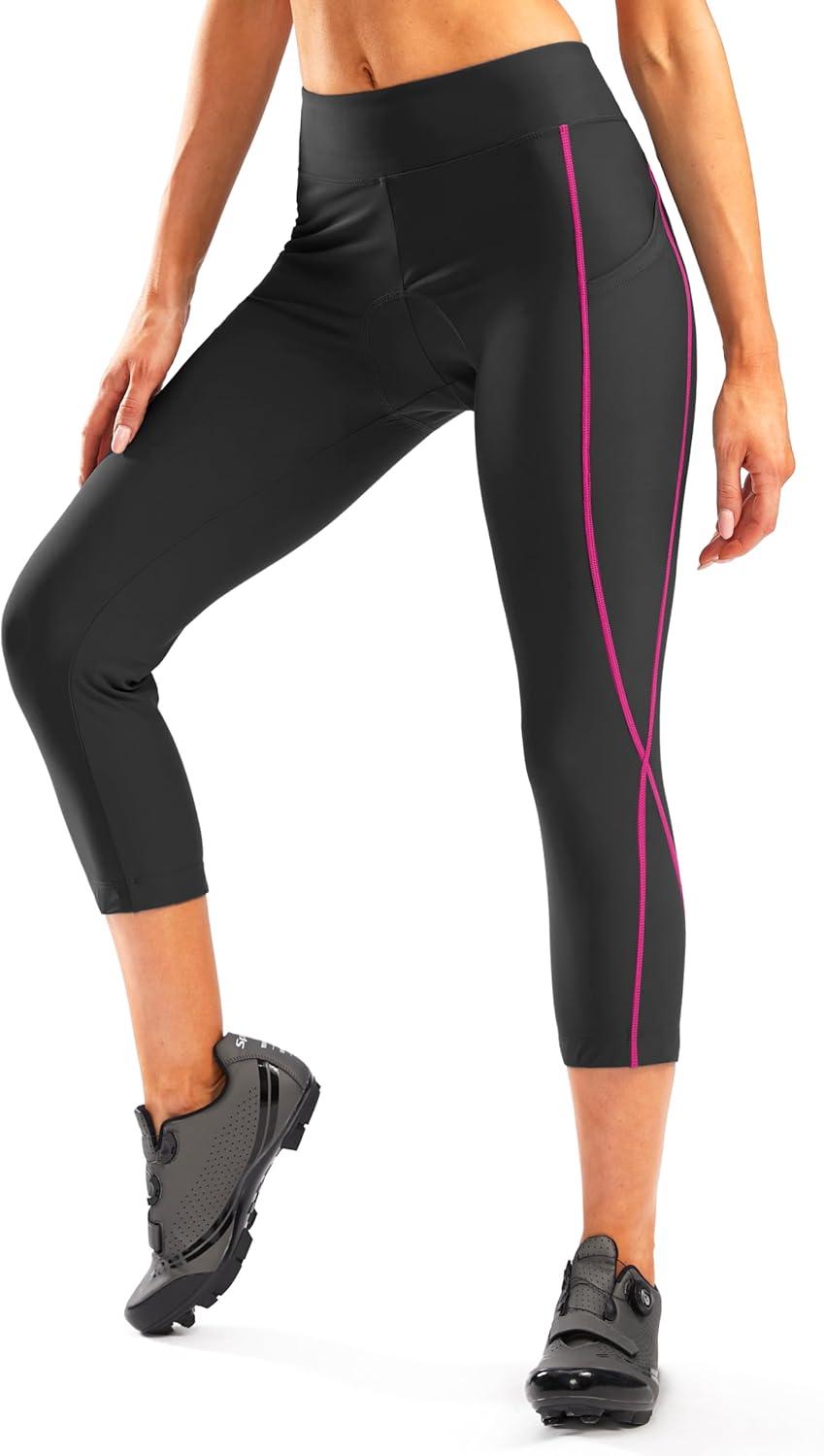 • Women’s 4D Padded Bike Pants High Waist Cycling Shorts Bicycle Capris 3/4 Biking Tights with Zipper Pockets(Black/Rosy)