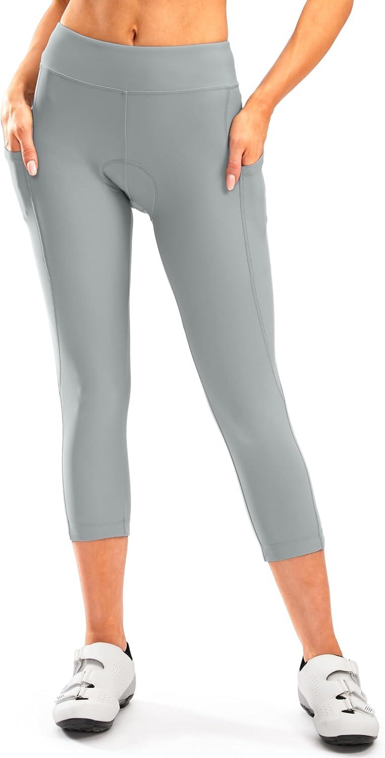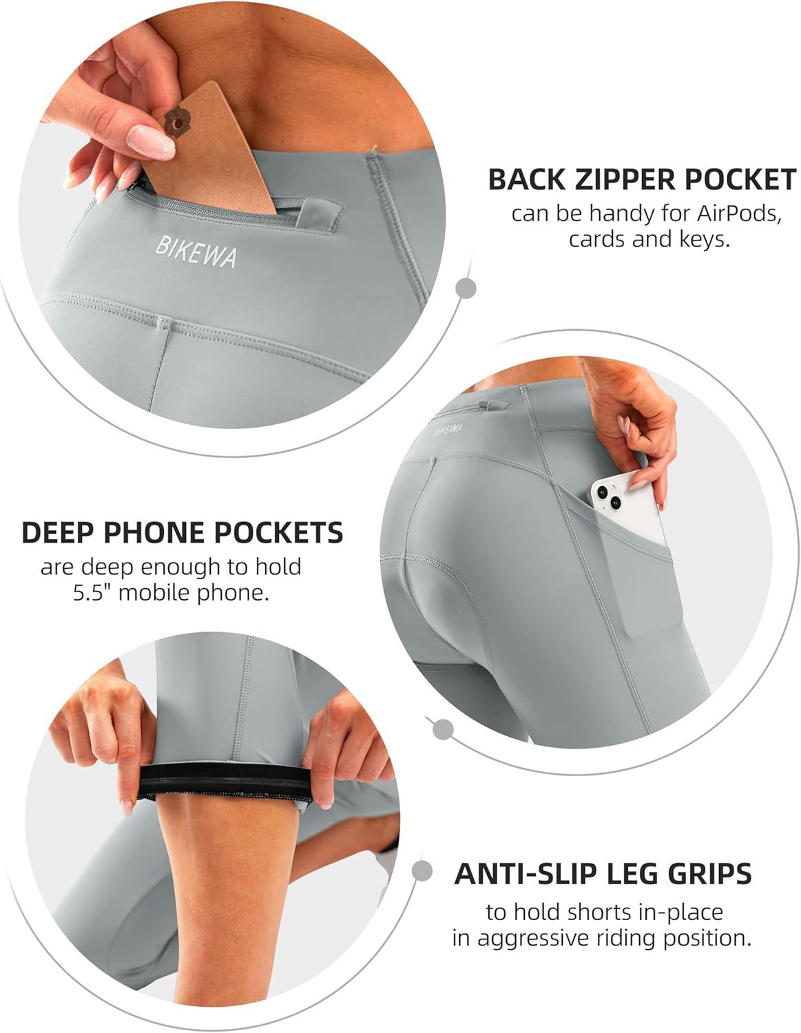 • Women’s 4D Padded Bike Pants High Waist Cycling Shorts Bicycle Capris 3/4 Biking Tights with Zipper Pockets(Light Grey)