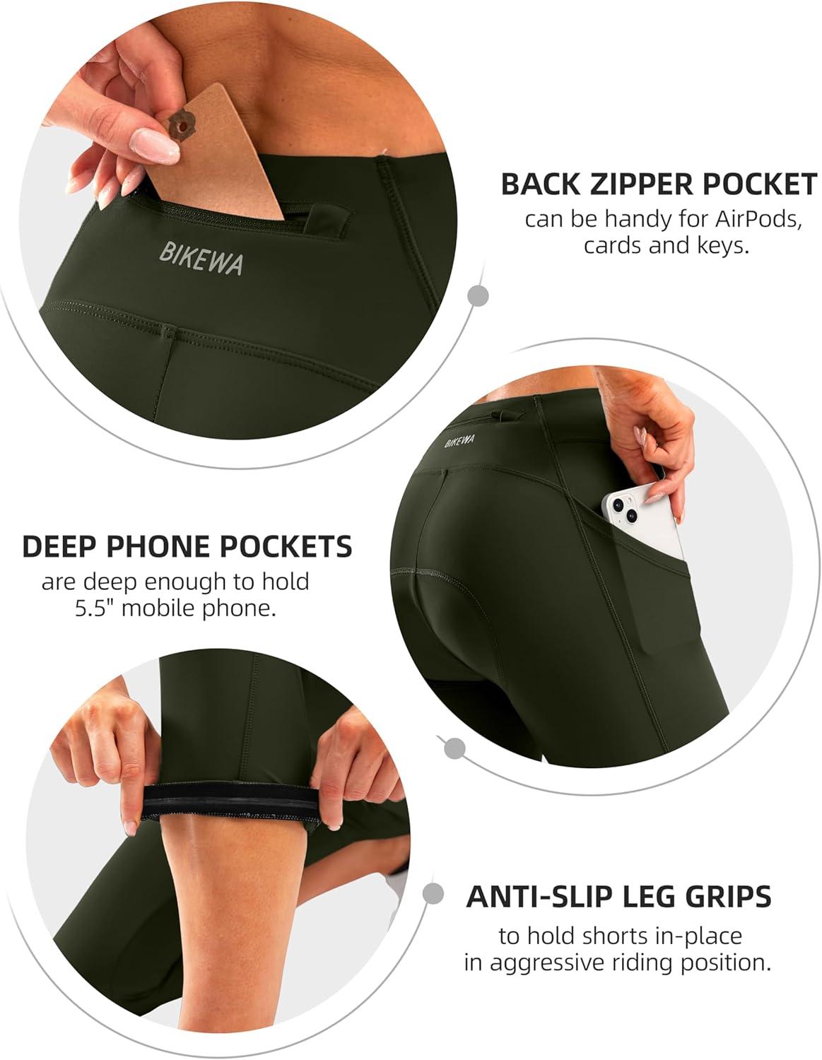• Women’s 4D Padded Bike Pants High Waist Cycling Shorts Bicycle Capris 3/4 Biking Tights with Zipper Pockets(Olive Green)