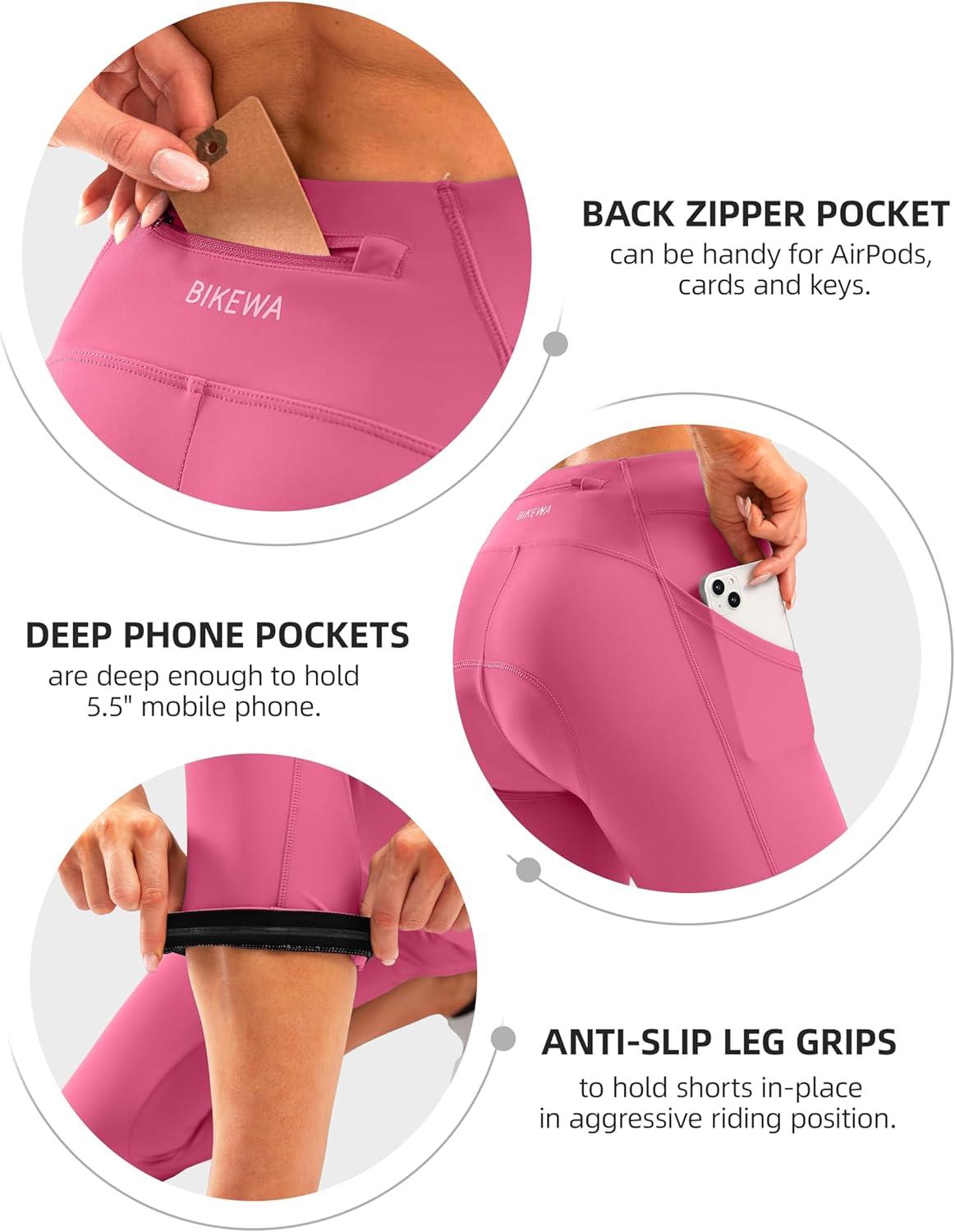 • Women’s 4D Padded Bike Pants High Waist Cycling Shorts Bicycle Capris 3/4 Biking Tights with Zipper Pockets(Pink)