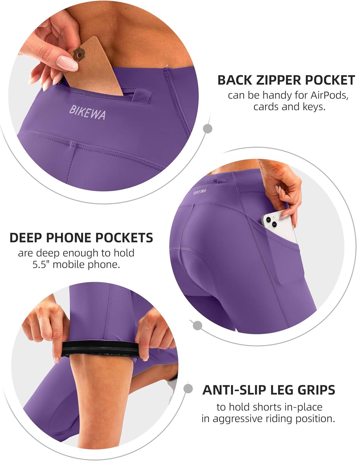 • Women’s 4D Padded Bike Pants High Waist Cycling Shorts Bicycle Capris 3/4 Biking Tights with Zipper Pockets(Purple)