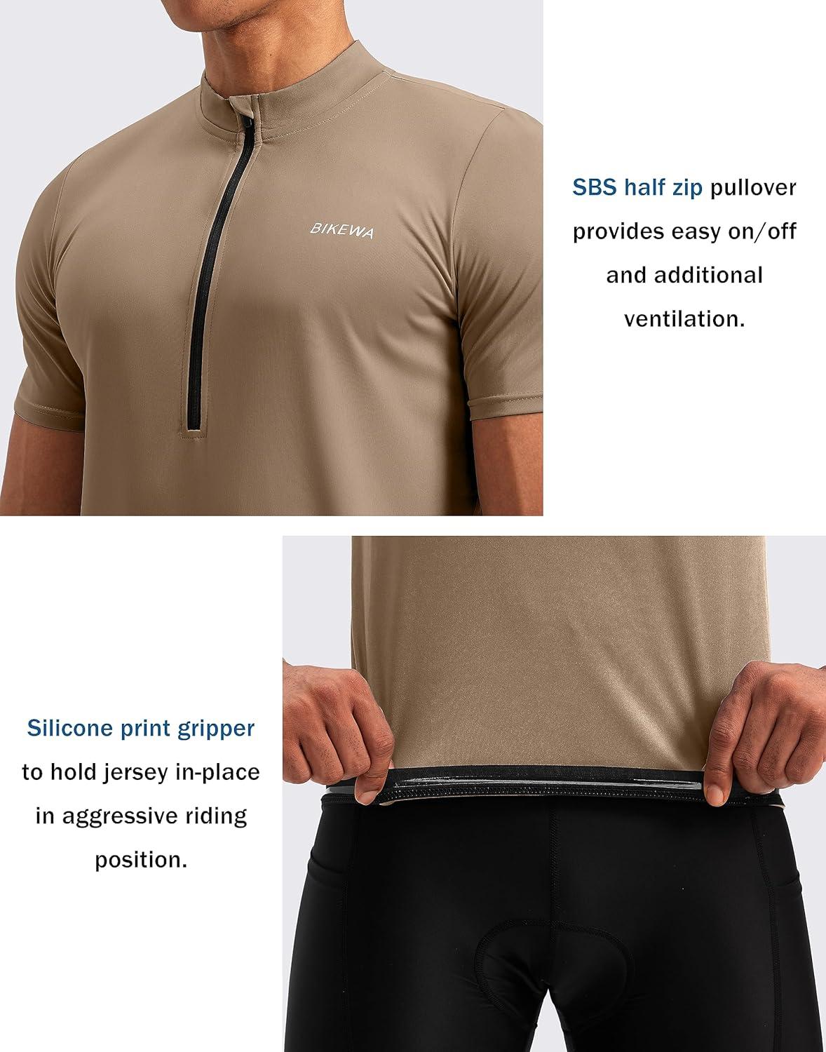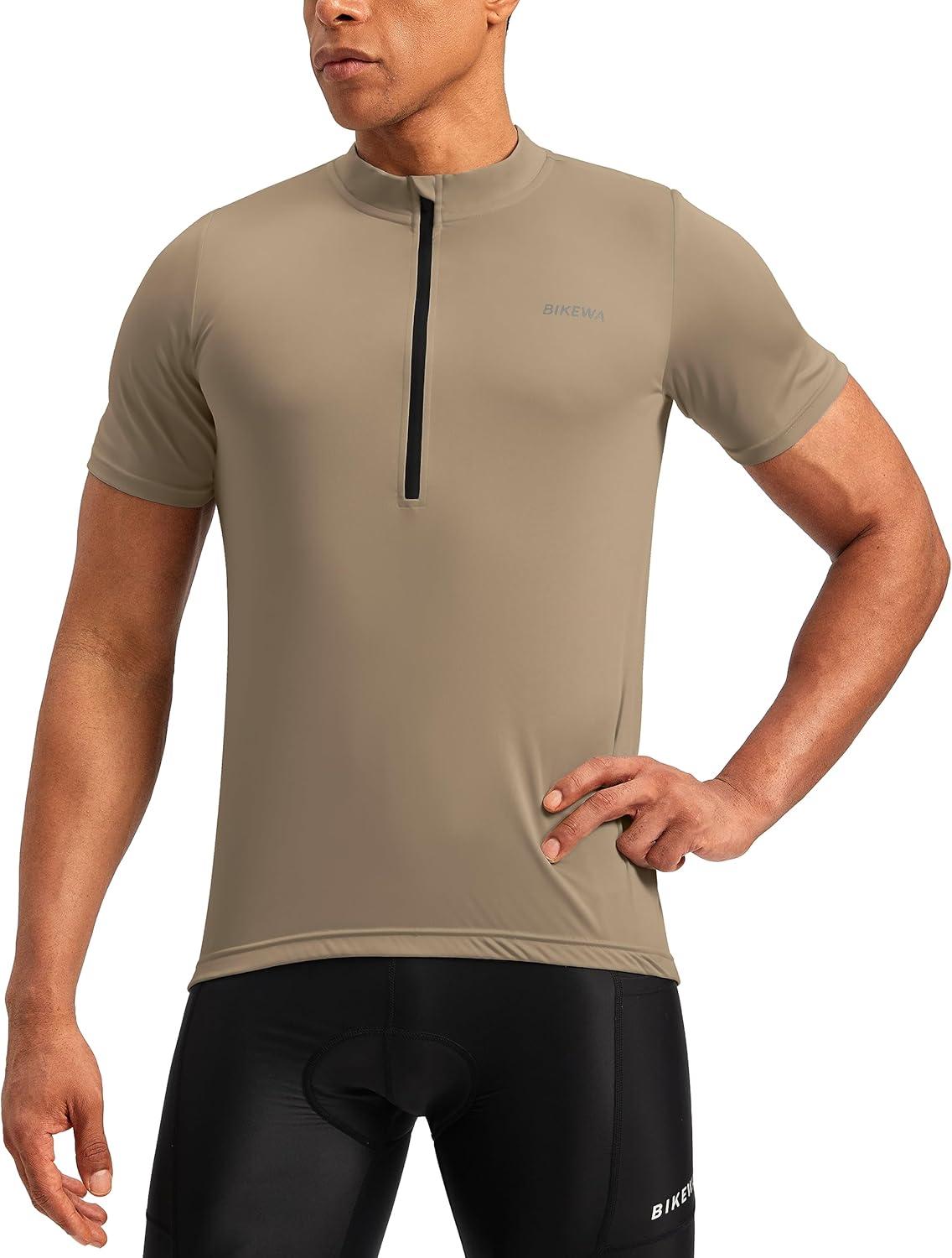 Bikewa Men’s Cycling Jersey Moisture Wicking Short Sleeve UPF Half Zip Bike Road Riding Biking Shirts for Men Zipper Pockets(Khaki)