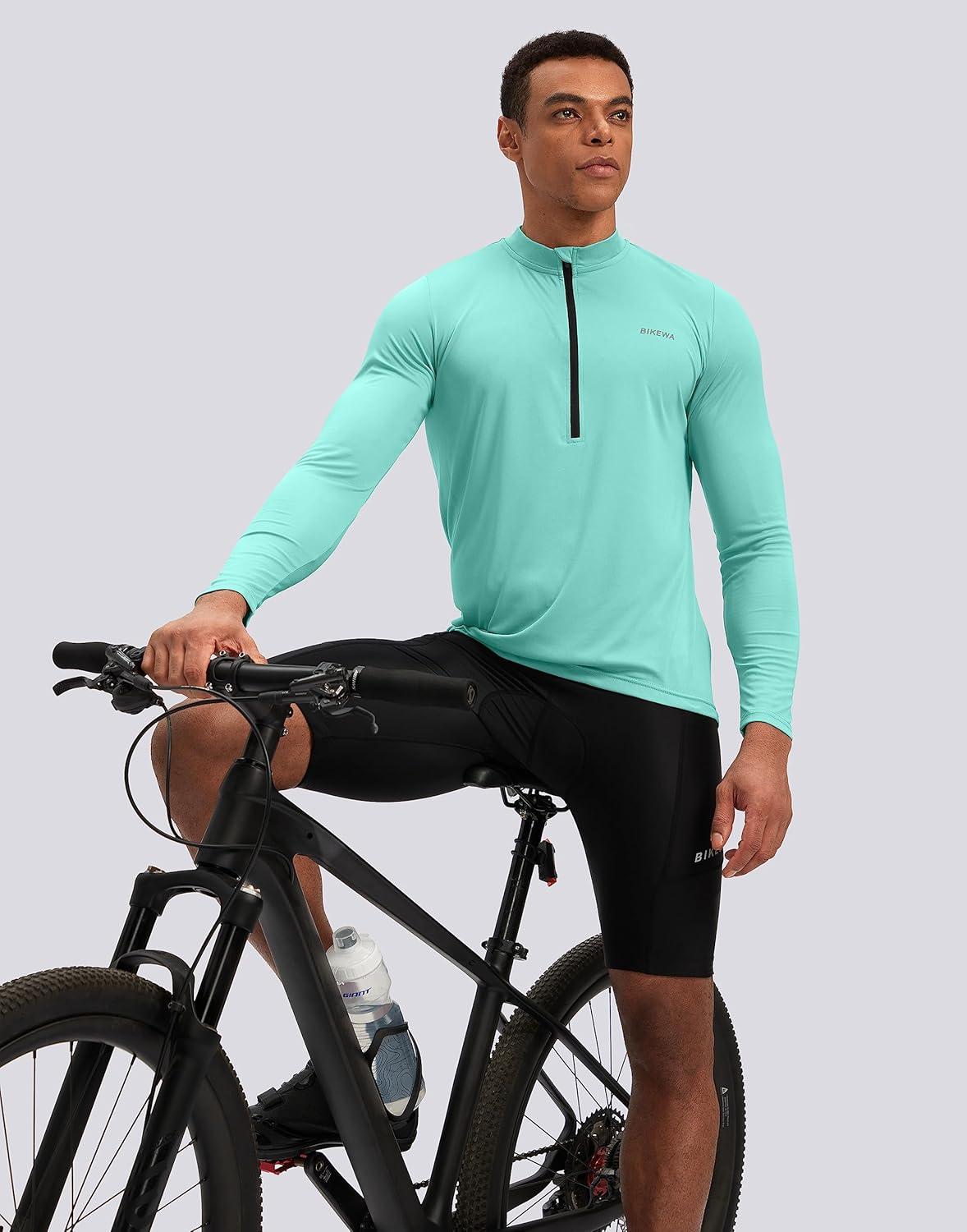 Bikewa Men’s Cycling Jersey with 3+1 Rear Zipper Pockets Long Sleeve Moisture Wicking UPF 50+ Half Zip Riding Bike Shirts(Light Green)